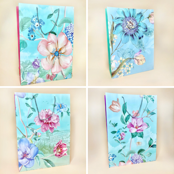 Набір стильних подарункових пакетів у ніжних відтінках блакитного та рожевого. Кожен пакет прикрашений акварельними квітами — півоніями, ліліями та іншими весняними мотивами. Виготовлені з щільного паперу, мають міцні шнуркові ручки. Ідеально підійдуть для жіночних подарунків, днів народження, свят чи просто приємних сюрпризів.