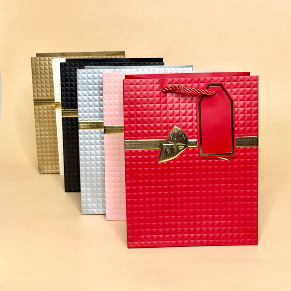 Стильний подарунковий пакет з преміальним тисненням — ідеальний варіант для упаковки подарунків на будь-яке свято. Щільний картон, фактурний візерунок та міцні шнурові ручки створюють елегантний вигляд і забезпечують надійну витримку ваги.