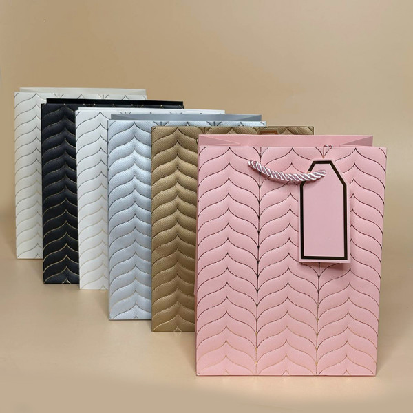 Стильний подарунковий пакет з преміальним тисненням — ідеальний варіант для упаковки подарунків на будь-яке свято. Щільний картон, фактурний візерунок та міцні шнурові ручки створюють елегантний вигляд і забезпечують надійну витримку ваги.
