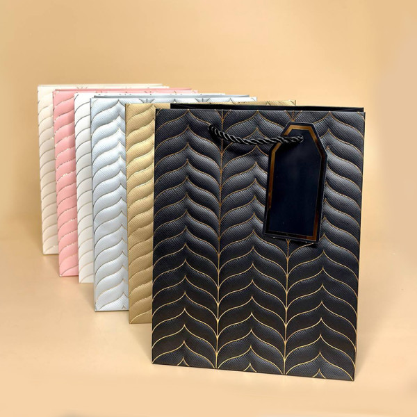 Стильний подарунковий пакет з преміальним тисненням — ідеальний варіант для упаковки подарунків на будь-яке свято. Щільний картон, фактурний візерунок та міцні шнурові ручки створюють елегантний вигляд і забезпечують надійну витримку ваги.