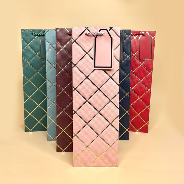 Елегантний подарунковий пакет, призначений для оформлення пляшки вина, шампанського або іншого напою. Виконаний в однотонних кольорах із декоративною золотою вставкою у верхній частині, що надає пакету святкового та преміального вигляду.