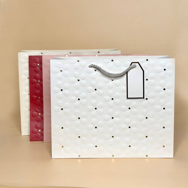 Стильний подарунковий пакет з преміальним тисненням — ідеальний варіант для упаковки подарунків на будь-яке свято. Щільний картон, фактурний візерунок та міцні шнурові ручки створюють елегантний вигляд і забезпечують надійну витримку ваги.