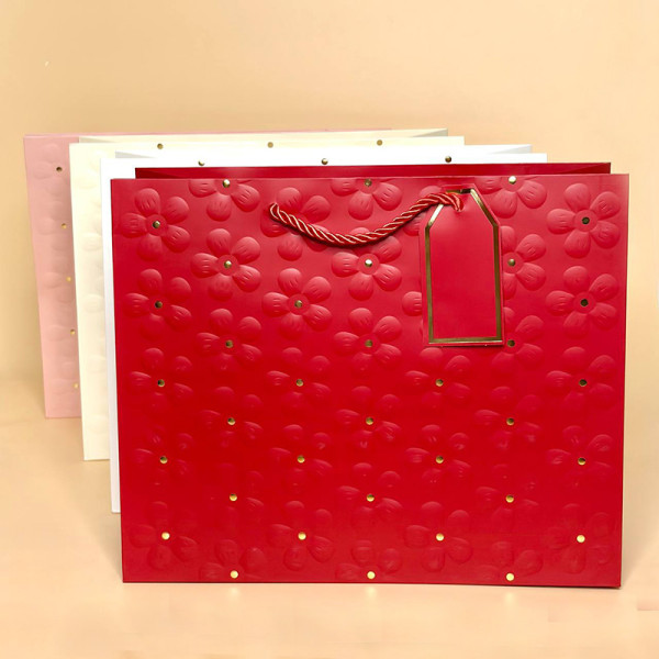 Стильний подарунковий пакет з преміальним тисненням — ідеальний варіант для упаковки подарунків на будь-яке свято. Щільний картон, фактурний візерунок та міцні шнурові ручки створюють елегантний вигляд і забезпечують надійну витримку ваги.