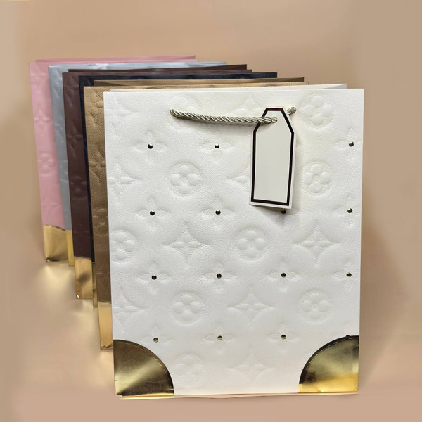 Преміальний подарунковий пакет з елегантним тисненням та декоративними золотими вставками — стильне рішення для упаковки подарунків на будь-яке свято. Щільний картон, фактурне покриття та міцні шнурові ручки роблять пакет не лише красивим, а й практичним.