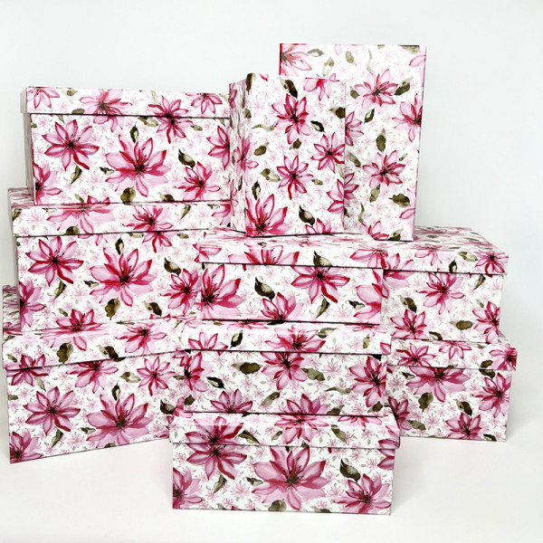 Набір подарункових коробок із насиченим принтом тропічних квітів створений для тих, хто любить яскравість і святковий настрій. У комплект входить 10 коробок різних розмірів, які зручно складаються одна в одну.