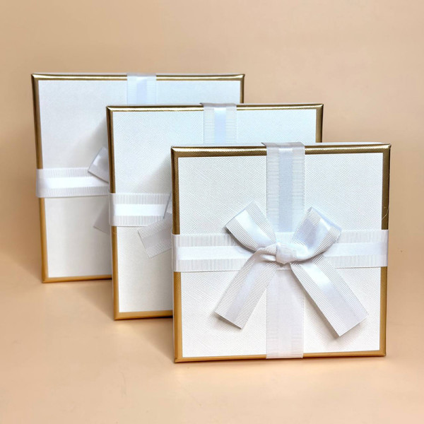 Стильний набір подарункових коробок, оформлених елегантними атласними бантами. Коробки мають жорстку конструкцію, акуратне оздоблення та виглядають святково й презентабельно. Ідеально підходять для оформлення подарунків на свята, дні народження, весілля, корпоративи чи інші особливі події.
