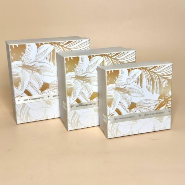 Стильний набір подарункових коробок, оформлених в ніжному дизайні Коробки мають жорстку конструкцію, акуратне оздоблення та виглядають святково й презентабельно. Ідеально підходять для оформлення подарунків на свята, дні народження, весілля, корпоративи чи інші особливі події.