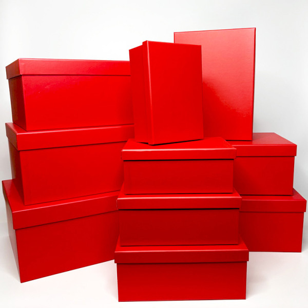 Стильний набір прямокутних подарункових коробок насиченого червоного кольору — ідеальне рішення для пакування подарунків, квіткових композицій, текстилю, аксесуарів чи сувенірів.