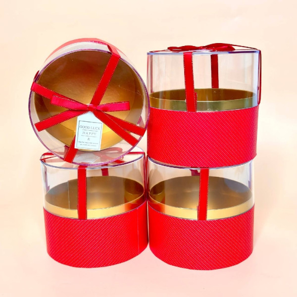 Подарункові коробки круглі з прозорою кришкою та стрічкою червоного кольору