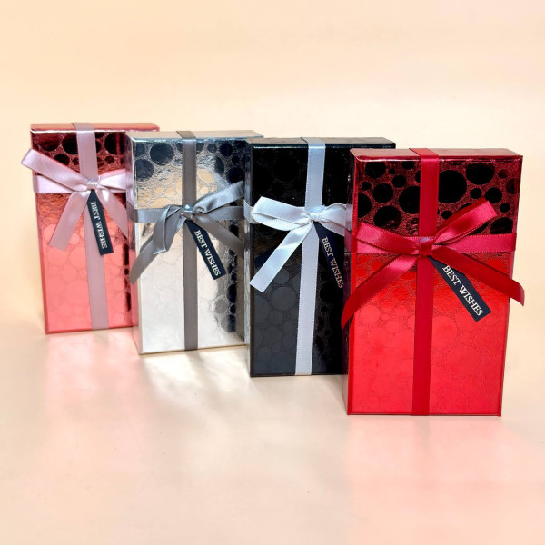 Елегантна подарункова коробка прямокутної форми з декоративним бантом — стильне рішення для красивого оформлення подарунків. Фактурне покриття надає коробці преміального вигляду, а міцний картон добре тримає форму та захищає вміст.