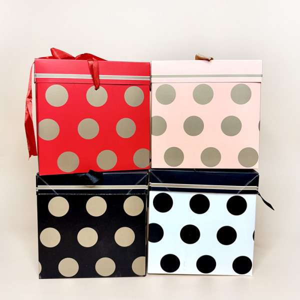 Яскраві коробки для подарунків з трендовим принтом у горох. . Верх оздоблений стрічкою та бантом, що додає святкового вигляду без потреби додаткового пакування. Ідеальні для одягу, косметики, солодощів чи сувенірів.