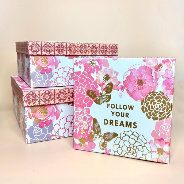 Набір стильних подарункових коробок у ніжно-рожевих відтінках із квітковим принтом і написом Follow Your Dreams.