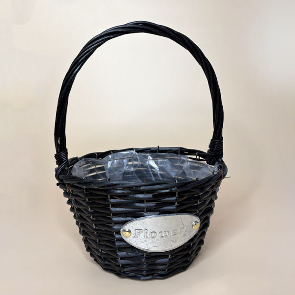 Елегантний плетений кошик чорного кольору з міцною ручкою та прозорою вологозахисною вкладкою. Ідеально підходить для оформлення квіткових композицій, подарункових наборів чи декоративного використання. Завдяки стильному дизайну та універсальності стане оригінальною основою для будь-якого презенту.