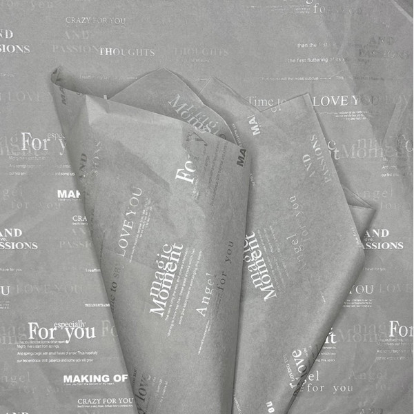Папір тіш’ю з декоративними написами LOVE та стильним глянцевим принтом — ідеальний вибір для оформлення букетів, подарунків та святкових композицій.