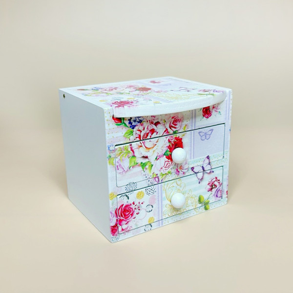 Модель оснащена верхнім відділенням з відкидним дзеркалом та двома висувними шухлядами для зберігання прикрас і аксесуарів. Завдяки компактному розміру шкатулка зручно розміщується на туалетному столику, комоді або полиці.